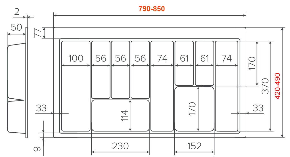 Khay chia thìa dĩa đa năng nhựa PP cao cấp màu xám 900mm GrandX XT.P900 được chia thành nhiều ô nhỏ với cách kích thước khác nhau giúp phân chia vật dụng nhà bếp được đơn giản hơn, ngay cả lúc cần tới chúng bạn sẽ không mất nhiều thời gian để tìm.