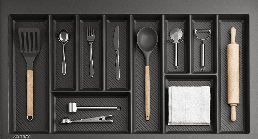 Với dao, thìa, dĩa... ăn hằng ngày chúng ta thường cất giữ chúng ở các giá đựng dành riêng cho các vật đúng đó. Còn đối với những vật dụng ít khi được sử dụng thì sẽ được cất trong các ngăn kéo, nhưng chúng ta không thể để chúng lẫn lộn vào nhau trong cùng một ngăn kéo được, mà sử dụng mỗi sản phẩm vào một ngăn kéo thì rất lãng phí, giải pháp đặt ra ở đây chính là sử dụng phụ kiện tủ bếp khay đựng dao, dĩa và dụng cụ nhà bếp.
