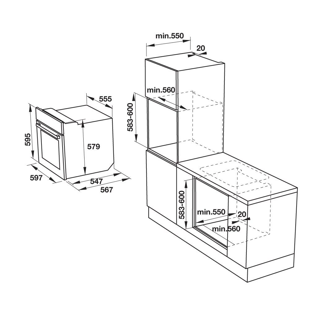- Kích thước hộc tủ: min 560R x 583-600C x 550S mm