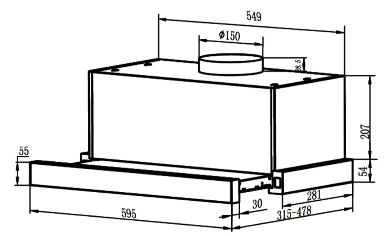 Máy hút mùi Faster FS SYP 60EB có kích thước R595 x S(315 - 478) x C261 (mm).