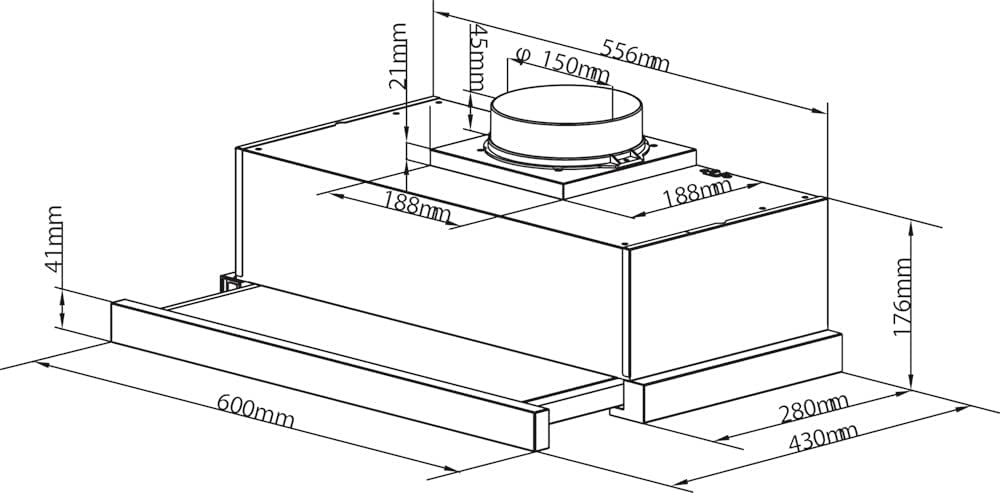 Máy hút mùi âm tủ SYP 6222B với chiều ngang 60cm cho phép hút mùi với khu vực rộng. Đồng thời, đường ống dẫn khí rộng 150mm mang đến khả năng hút mạnh mẽ và toàn diện.