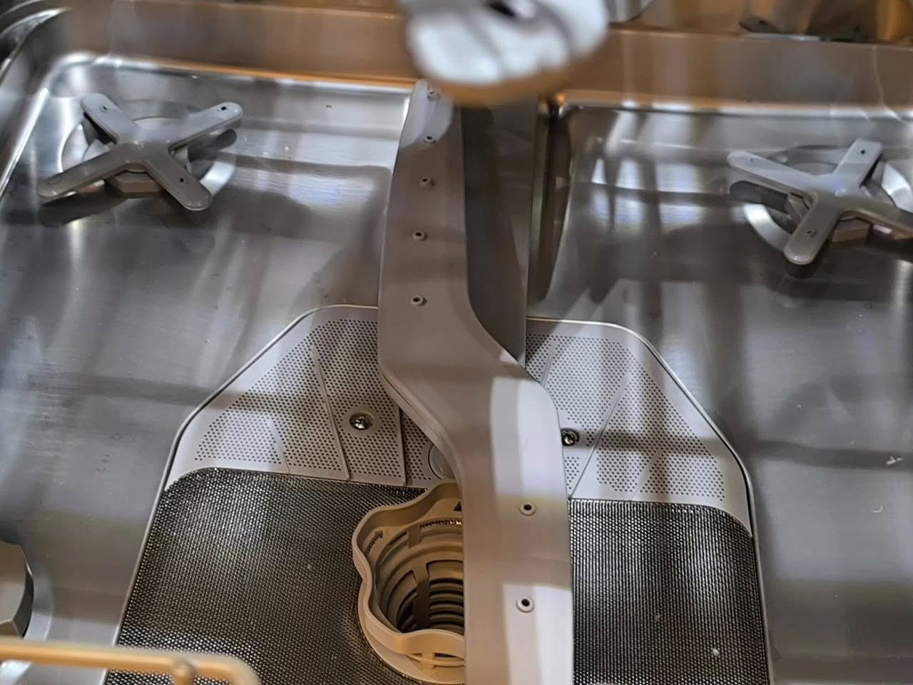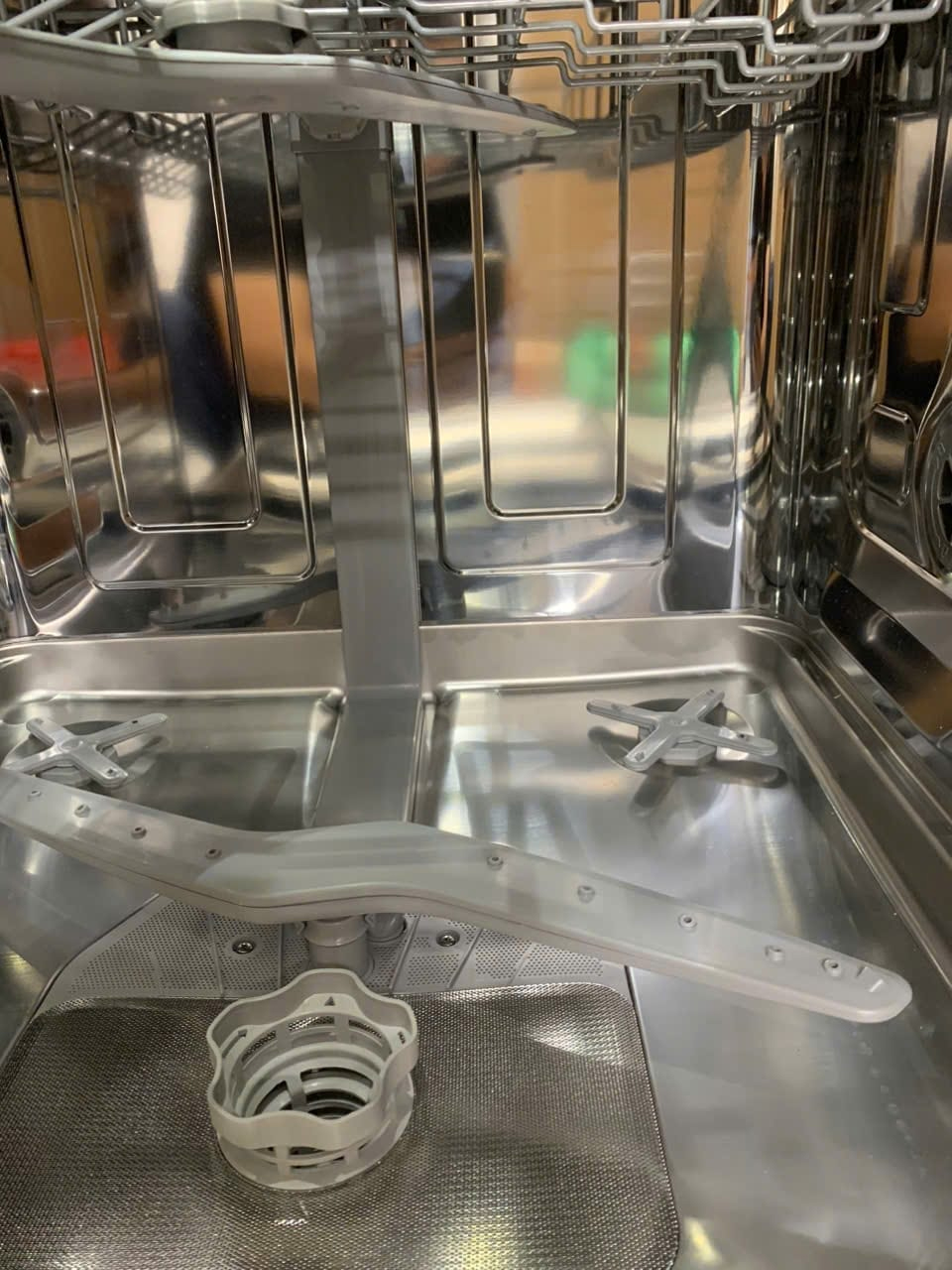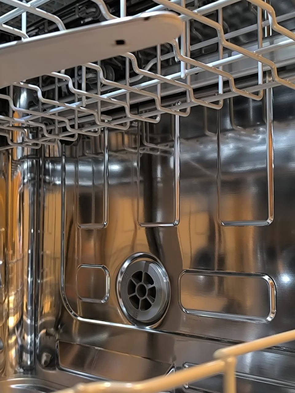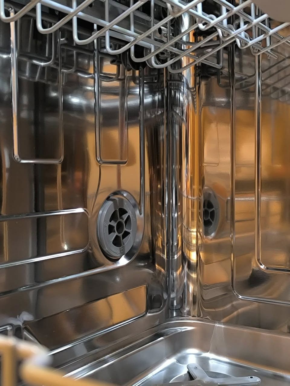 Giàn rửa dưới cùng của máy có khoang chứa rộng hơn, cho phép rửa các loại nồi nấu, chảo, bát đĩa to....Các loại đĩa thìa, người dùng có thể cho vào vào giỏ màu xám ở trong khay rửa trên cùng hoặc xếp làm ngang, sao cho các không có bất cứ vật dụng nào cản trở vào tay quay gạt nước của máy.