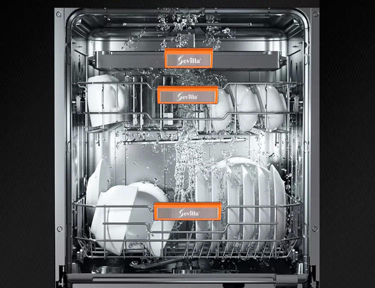 Máy rửa bát Sevilla SV-R19 trang bị 3 ngăn chứa cơ động. Hệ thống ray nâng hạ thông minh dễ dàng thay đổi chiều cao giữa các khay. Giàn rửa trên cùng thường để xếp các vật dụng như: dao, kéo hay đũa, thìa, dĩa, muỗng... Giàn rửa ở giữa chủ yếu rửa các loại bát đĩa nhỏ, cốc, ly, vật dụng nhỏ không tốn diện tích. Giàn rửa dưới cùng của máy có khoang chứa rộng hơn, cho phép rửa các loại nồi nấu, chảo, bát đĩa to....