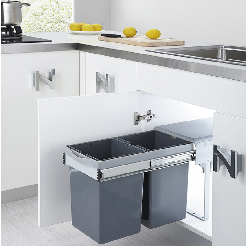 Thùng rác âm tủ 2 ngăn | Newera NE414.250 | 2 x 14 lít | lắp âm tủ cánh mở | thiết kế sang trọng cho không gian bếp tiện nghi