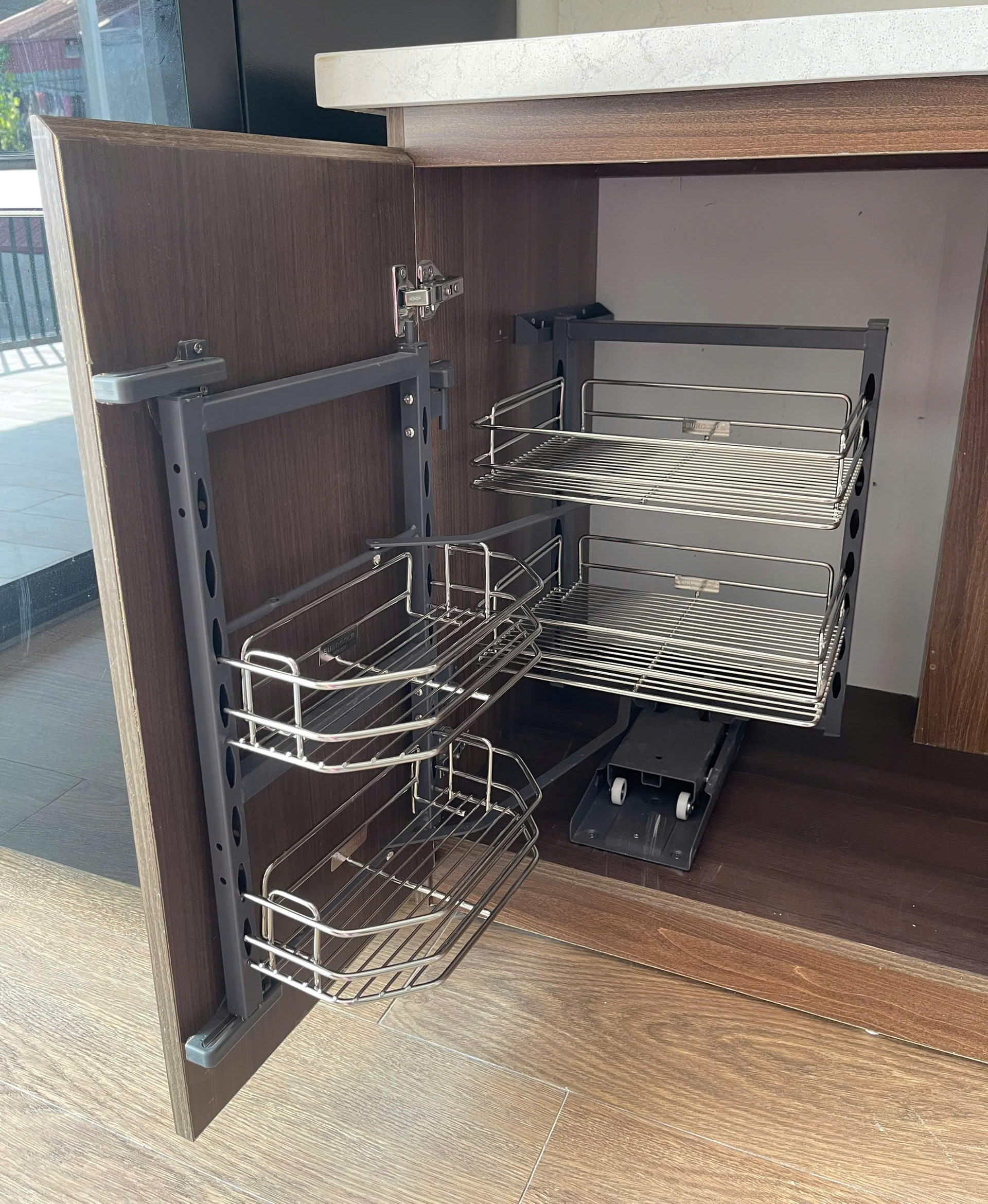 Thiết kế liên kết mở cửa giúp toàn bộ khay chứa được kéo ra ngoài chỉ bằng một lần mở cánh tủ, người dùng dễ dàng quan sát và lấy đồ bên trong. Lắp đặt linh hoạt, các khay chứa có thể điều chỉnh vị trí lắp cho phù hợp với chiều cao của các vật dụng nhà bếp bất kỳ nào mà không làm lãng phí không gian tủ.