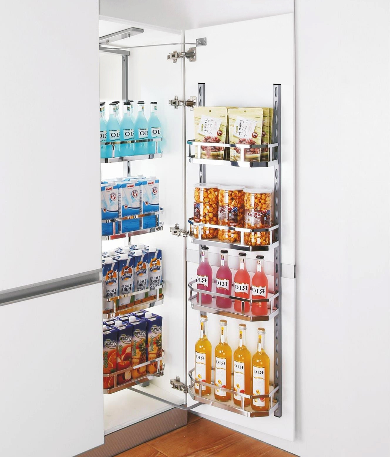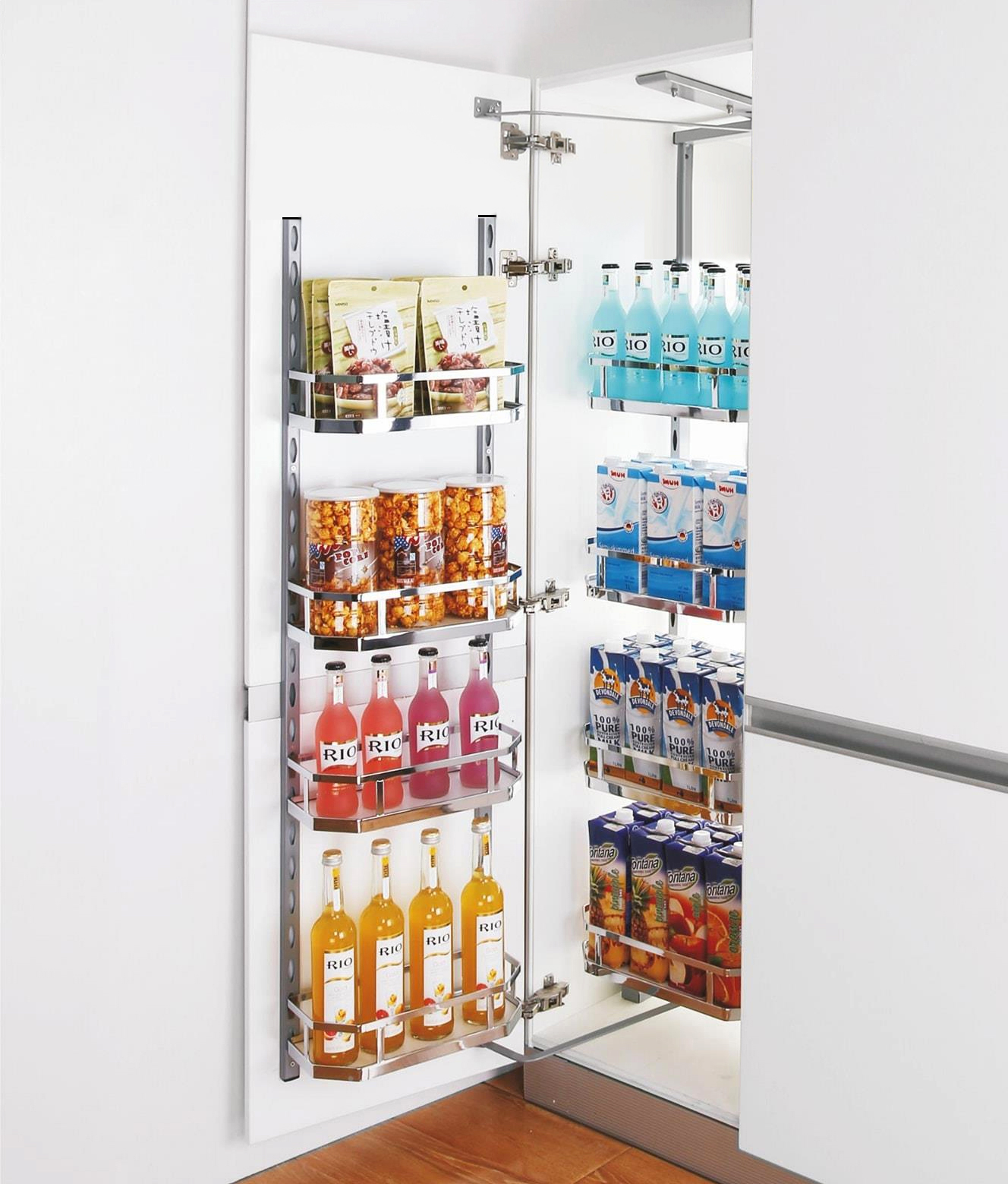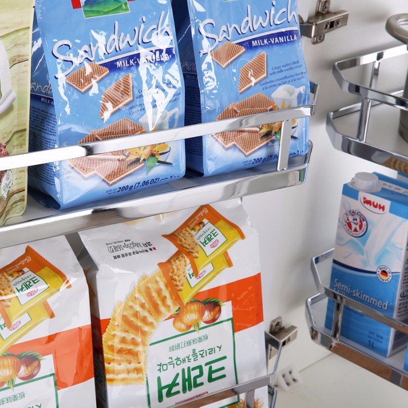 Thiết kế liên kết mở cửa giúp toàn bộ khay chứa được kéo ra ngoài chỉ bằng một lần mở cánh tủ, người dùng dễ dàng quan sát và lấy đồ bên trong. Lắp đặt linh hoạt, các khay chứa có thể điều chỉnh vị trí lắp cho phù hợp với chiều cao của các vật dụng nhà bếp bất kỳ nào mà không làm lãng phí không gian tủ.