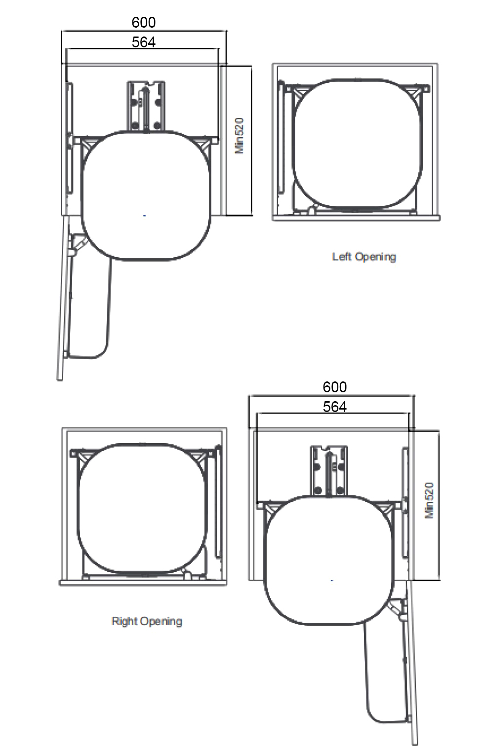 Chiều rộng rộng lọt lòng tủ tối thiểu: ≥ 564 (mm)
