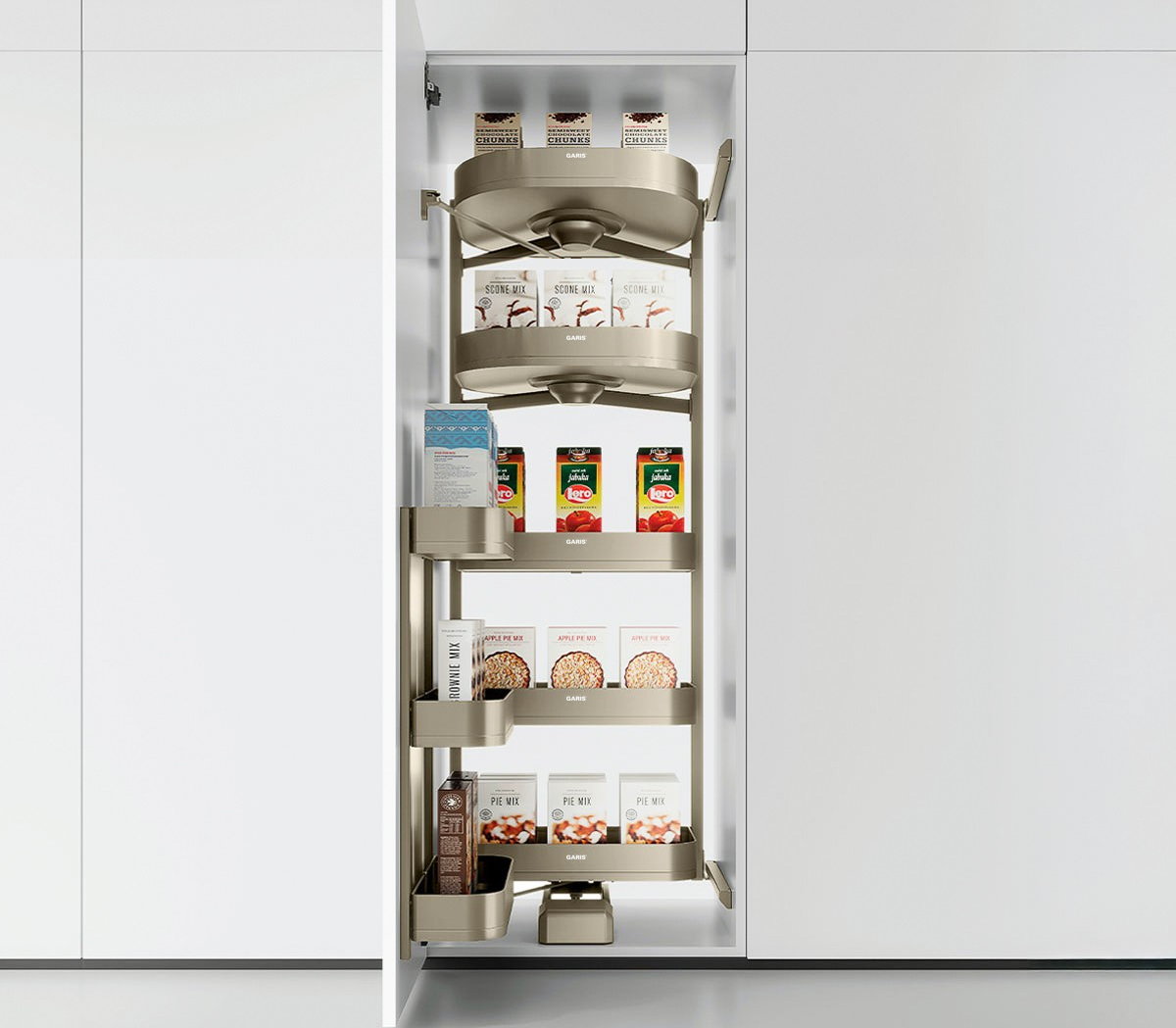 Tủ đồ khô 5 tầng 8 rổ hệ cánh mở 600mm Garis GS5.6AG có thiết kế đa năng tích hợp để được chai lọ, gia vị, đồ khô... vào cùng một sản phẩm. Các khay đựng được thiết kế linh hoạt phù hợp với nhiều kích thước chai lọ, gia vị, đồ khô... khác nhau trong không gian bếp.