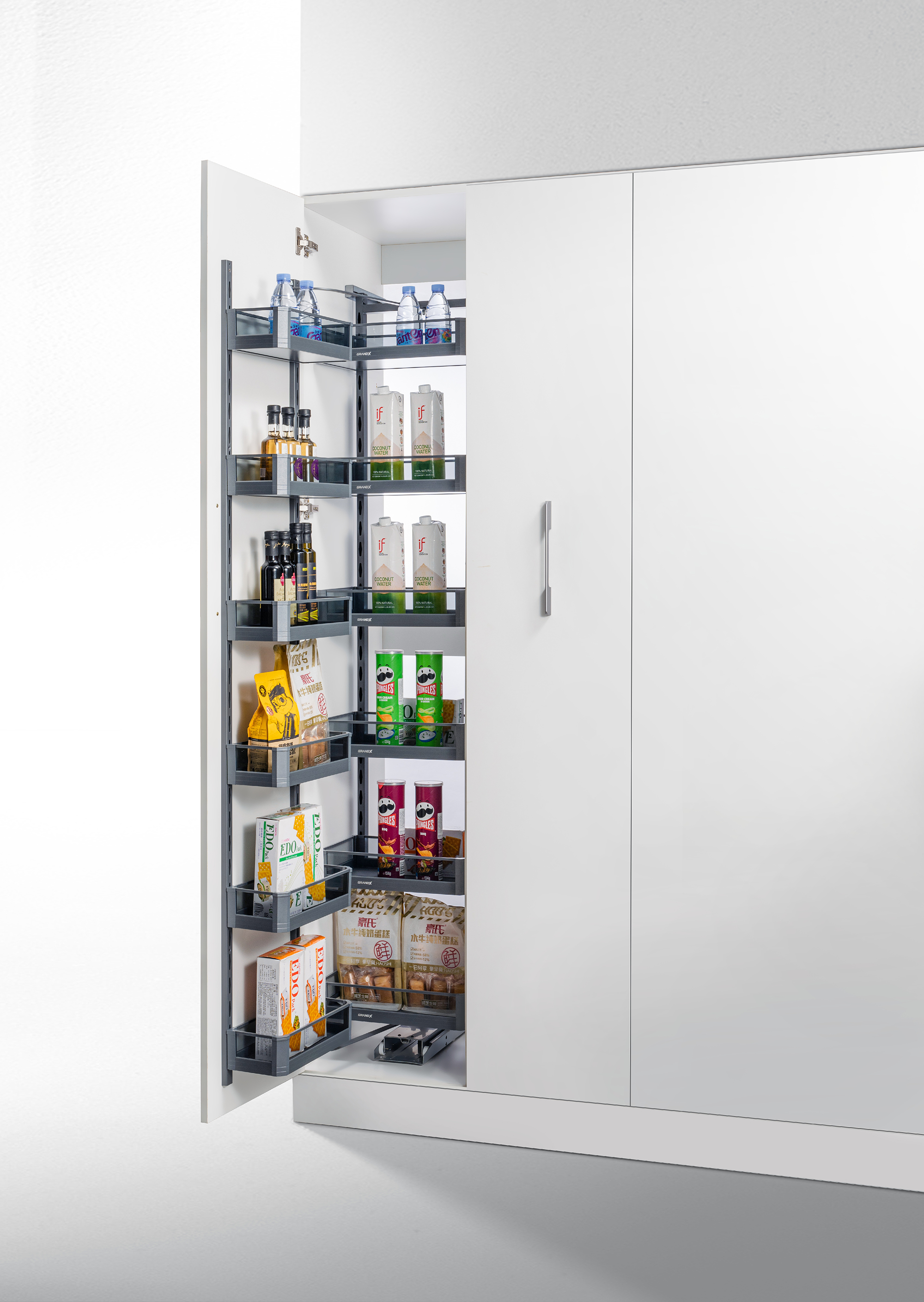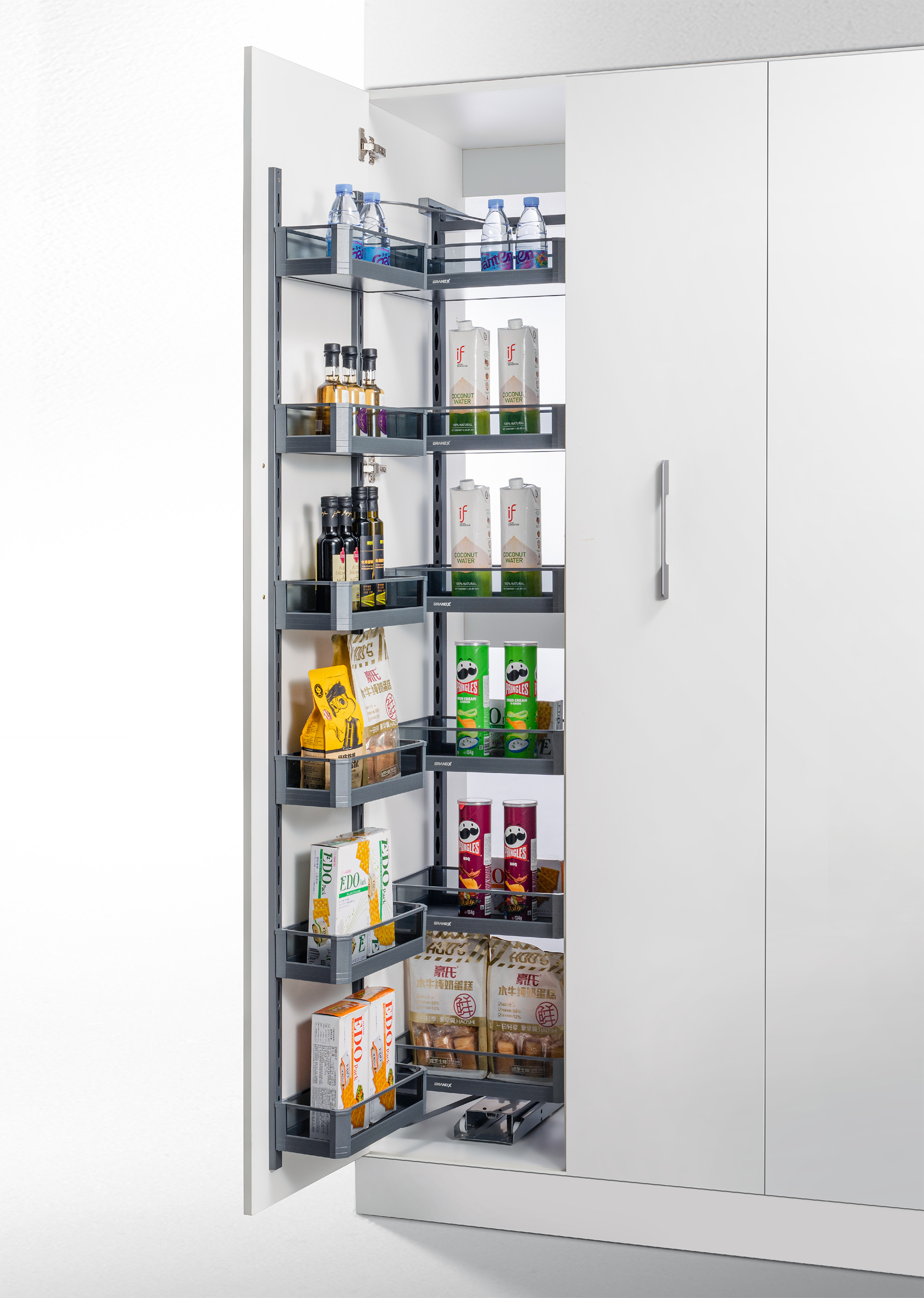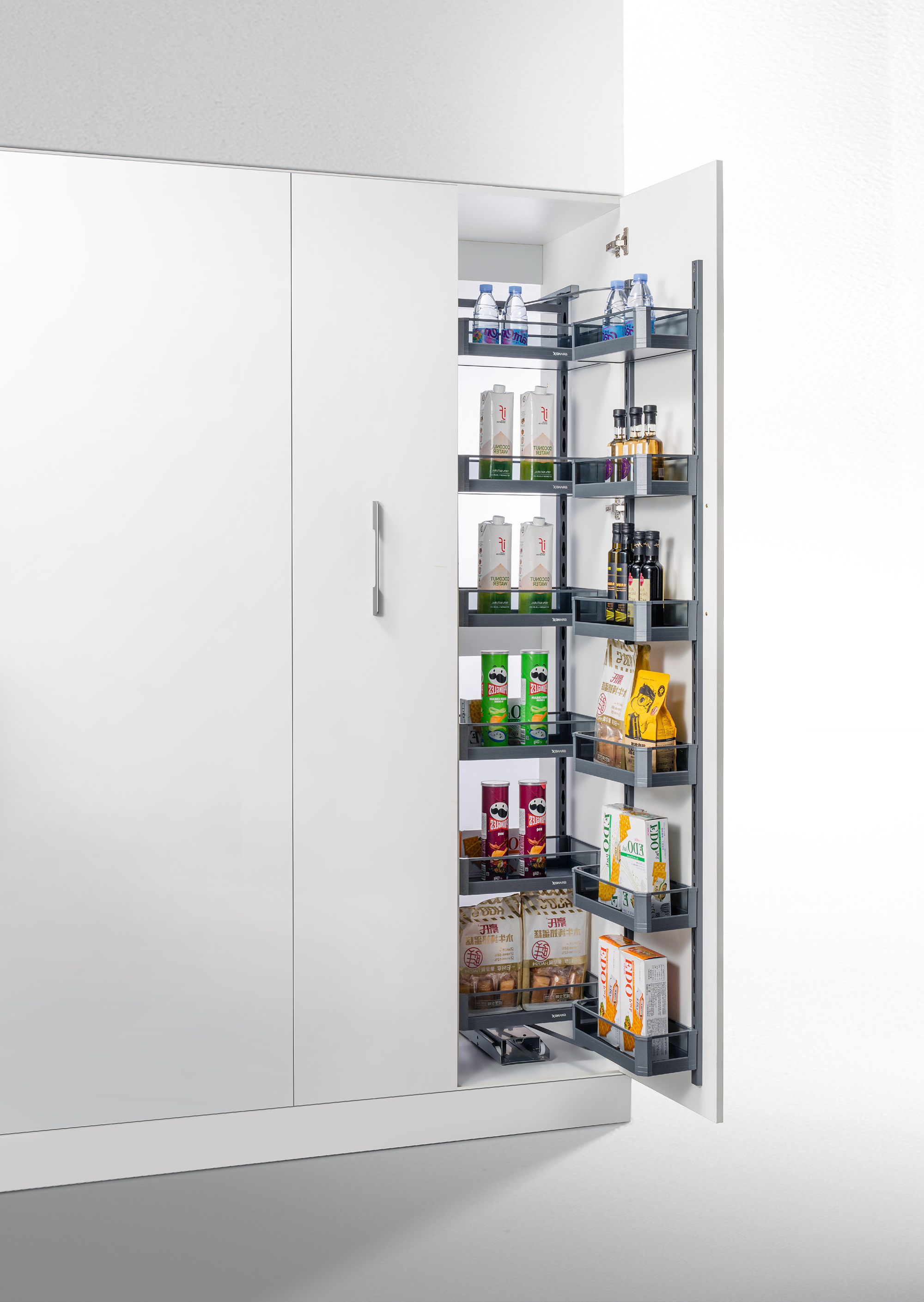 Thiết kế liên kết mở cửa giúp toàn bộ khay chứa được kéo ra ngoài chỉ bằng một lần mở cánh tủ, người dùng dễ dàng quan sát và lấy đồ bên trong. Lắp đặt linh hoạt, các khay chứa có thể điều chỉnh vị trí lắp cho phù hợp với chiều cao của các vật dụng nhà bếp bất kỳ nào mà không làm lãng phí không gian tủ.