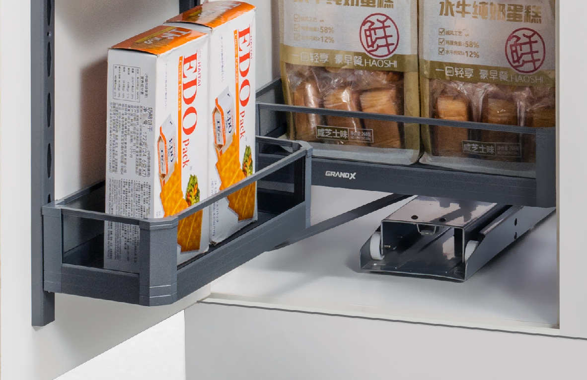Thiết kế trượt đôi, tăng cường khả năng chịu tải của sản phẩm và giữ cho phần kéo ra ổn định. Công nghệ Đức, chịu tải siêu cao, thanh dẫn hướng cấu trúc con lăn mở rộng, cấu trúc liên kết đơn giản và hoàn toàn mới, kéo giỏ bên trong ra khi mở cửa. Điểm chịu tải của cửa tủ tập trung vào đáy tủ, bảo vệ cửa không bị biến dạng.
