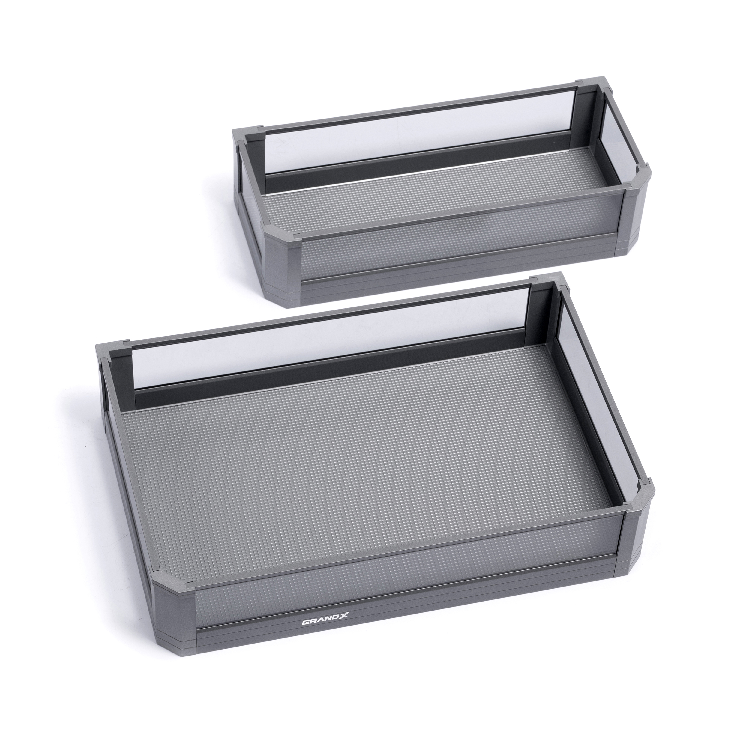 Tủ đồ khô 6 tầng hệ khay nhôm vách kính lắp âm tủ cánh mở dành cho khoang tủ rộng 450mm GrandX XPR.450G thiết kế dạng khay hợp kim nhôm góp phần tạo cảm giác chắc chắn, khỏe khoắn. Ngoài ra với 6 tầng, 12 rổ đựng được thiết kế thu gọn trong khoang tủ góp phần tăng tính thẩm mĩ, tiết kiệm không gian cho căn bếp. Đặc biệt phù hợp với gia đình hộ chung cư, gia đình có không gian bếp nhỏ.