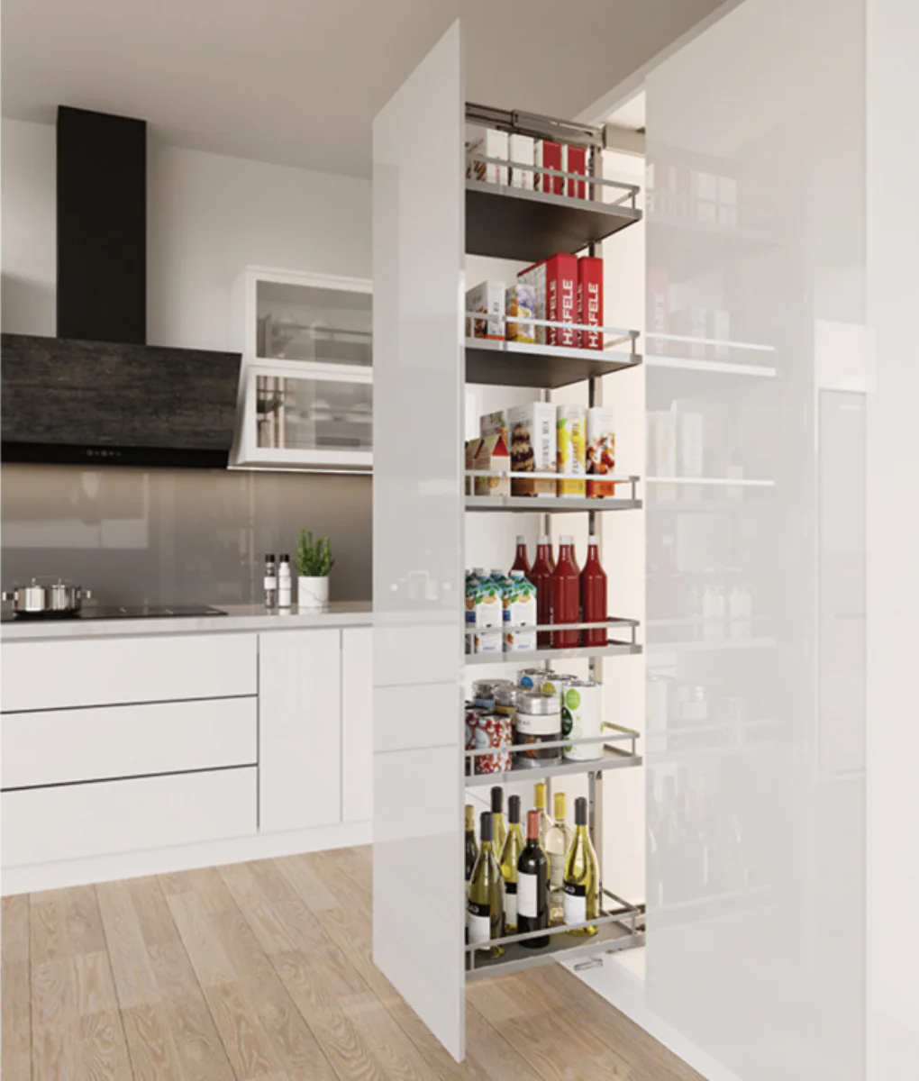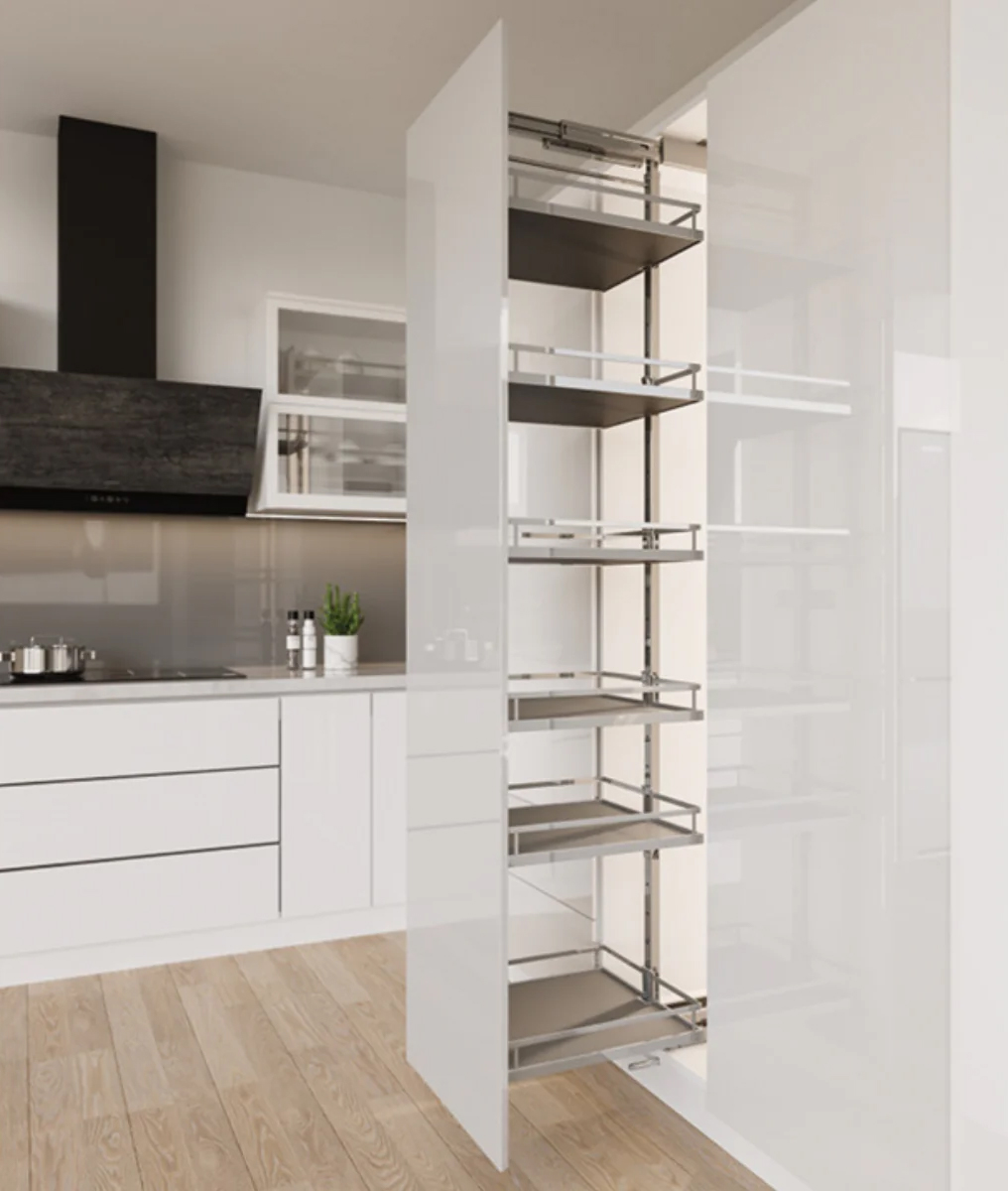 Thiết kế liên kết kéo cửa giúp toàn bộ khay chứa được kéo ra ngoài chỉ bằng một lần rút cánh tủ, người dùng dễ dàng quan sát và lấy đồ bên trong. Lắp đặt linh hoạt, các khay chứa có thể điều chỉnh vị trí lắp cho phù hợp với chiều cao của các vật dụng nhà bếp bất kỳ nào mà không làm lãng phí không gian tủ.