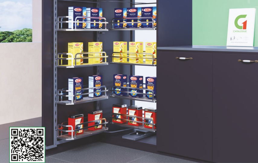 Thiết kế dạng nan góp phần tạo cảm giác nhẹ nhàng, thanh thoát cho tủ kho. Ngoài ra với thiết kế 4 tầng, 8 rổ đựng thì được thiết kế thu gọn trong khoang tủ góp phần tăng tính thẩm mĩ, tạo sự gọn gàng cho căn bếp nhà bạn.