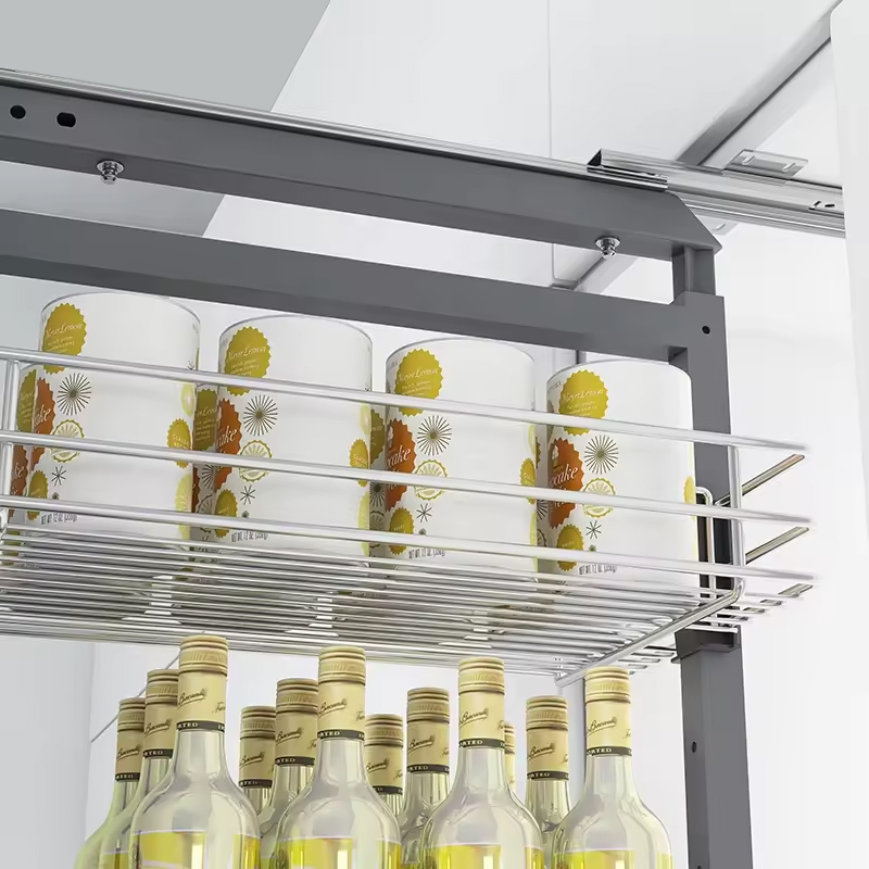 Thiết kế liên kết kéo cửa giúp toàn bộ khay chứa được kéo ra ngoài chỉ bằng một lần rút cánh tủ, người dùng dễ dàng quan sát và lấy đồ bên trong. Lắp đặt linh hoạt, các khay chứa có thể điều chỉnh vị trí lắp cho phù hợp với chiều cao của các vật dụng nhà bếp bất kỳ nào mà không làm lãng phí không gian tủ.